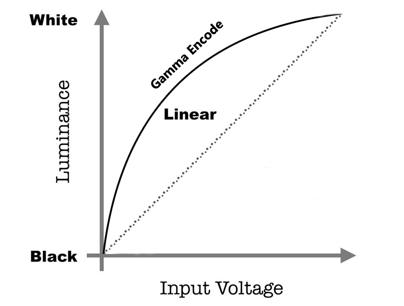 人眼对明暗感受非线性,对暗部更敏感。符合传递函数Gamma为2.2时的线条变化